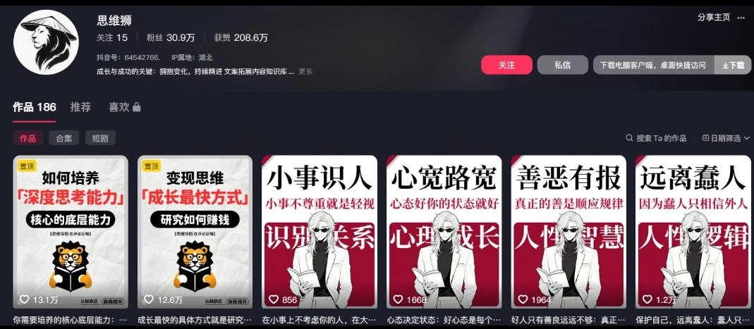 - 比如玄川最近发现的这个博主:186个作品,30.9万粉丝280.6万获赞。