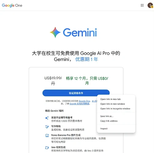 - 今天教大家如何无纯净ip开通 Gemini 学生会员。(所有用到的链接放在最后)